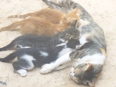 Szybko okazało się, że za murkiem, w ogrodzie gdzie nikt nie mieszka, Mietka wychowuje czwórkę nowo narodzonych dzieci. Rezolutne kociaki coraz częściej przeskakiwały na nasz teren. Ot powód jej chudości – Mietka swoje małe karmiła przecież piersią!
