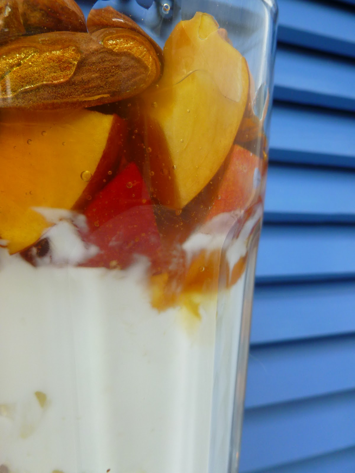 put a portion of Greek yogurt in a bowl. Add  one peach cut in pieces. Add a few almonds and two spoons of honey. Then sprinkle with cinnamon.  And it’s ready!
