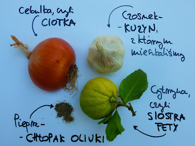 Składniki, które w tradycyjnej sałatce raczej nie występują, ale jako postacie pojawiły się w blogu, to: Czosnek, czyli kuzyn u którego mieszkaliśmy. Cytrynka – matka Ogórka, albo inaczej siostra Fety. A Pieprz to chłopak Olivki – zakochany w niej nadal i niezmiennie!